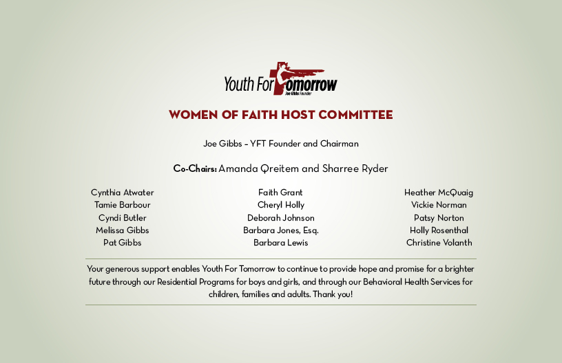 “I believe there is nothing more important in life than what we leave behind in terms of how we have helped others. Years from now no one wil remember who had a great season or who won the Super Bowl. That’s why Youth For Tomorrow is so important. For each child that we help, we start a chain of good results because he or she will influence his or her own spouse and children and others around them. And they will pass along what they have learned to others. What will last in this world is what kind of influence we had on others and making a difference in the life of a child.” – Coach Joe Gibbs
